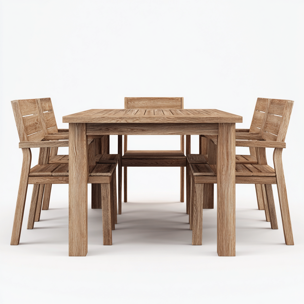 Struttura realizzata interamente in legno con finitura naturale. Il piano del tavolo è composto da doghe regolari, mentre le sedie presentano una costruzione solida progettata per l'utilizzo in ambienti esterni.