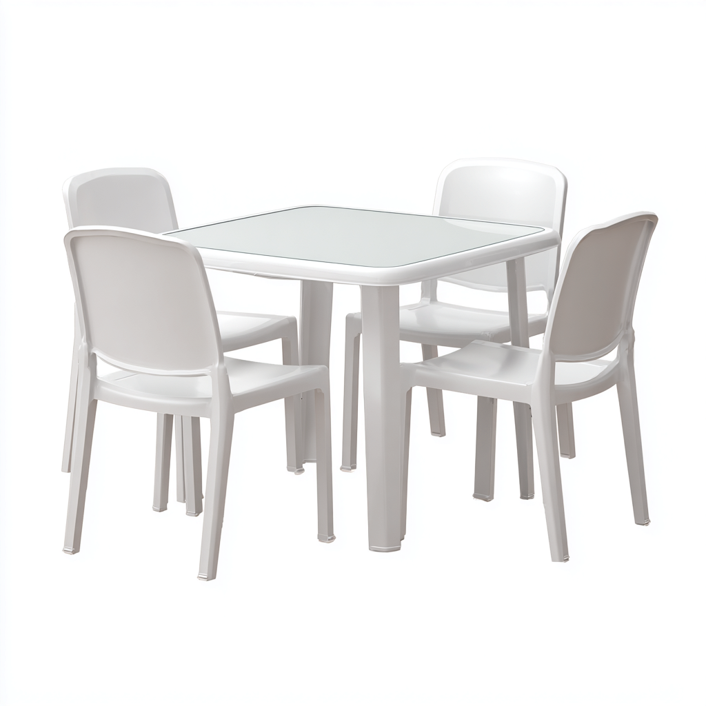 Struttura realizzata in plastica di colore bianco, progettata per garantire stabilità e facilità di manutenzione. Il piano del tavolo è in vetro, integrato in una cornice solida per una superficie uniforme.