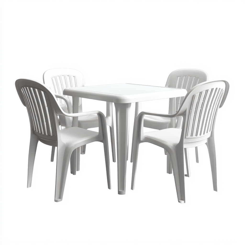 Struttura realizzata in plastica di colore bianco, scelta per la sua facilità di manutenzione e stabilità. Il piano del tavolo è in vetro, inserito in una cornice solida che assicura una superficie regolare.
